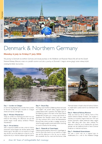 We journey to Denmark via northern Germany and include journeys on the Mollibahn and Rasender Roland. We will visit the Danish