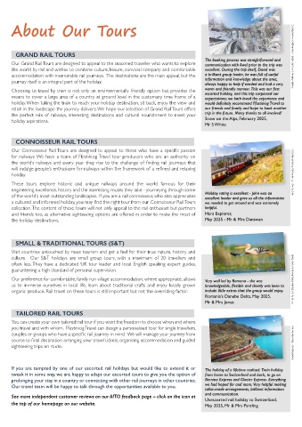 organic produce. Rail travel on these tours is still important but not the overriding factor. include little extras that the group would enjoy.