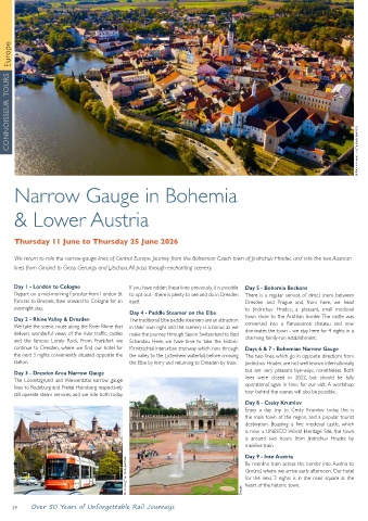 We return to ride the narrow-gauge lines of Central Europe. Journey from the Bohemian Czech town of Jindrichuv Hradec and ride the two Austrian