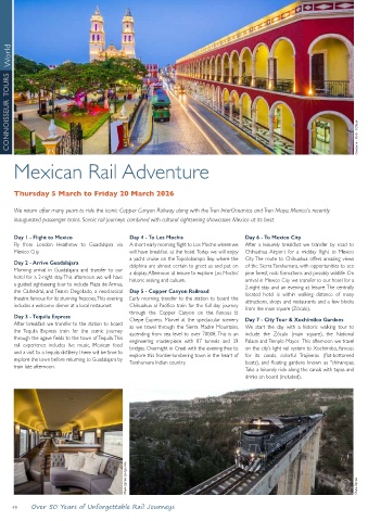 inaugurated passenger trains. Scenic rail journeys combined with cultural sightseeing showcases Mexico at its best.